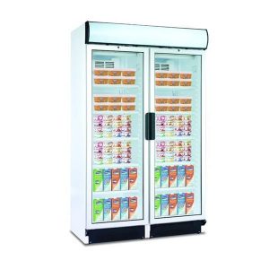 Expositor refrigerado vertical duplo, portas pivotantes em vidro