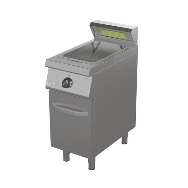 Container GN 1/1 para batatas com filtro de óleo. Armário inferior com portas. As batatas fritas mantêm-se aquecidas por infravermelhos. Container removível e de fácil limpeza.