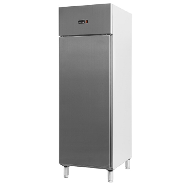 Interior e exterior em aço inoxidável, exceto painel posterior que é galvanizado. Isolamento de poliuretano injetado, sem CFC, com uma densidade de 40 Kg/m3. Portas dotadas de dobradiças com sistema de fecho automático e fixação da porta a 180º. Interior com cantos arredondados para uma fácil limpeza. Prateleiras em aço plastificadas facilmente removíveis para limpeza. Guias em aço inoxidável para suporte e ajuste das prateleiras. Pés em aço inoxidável reguláveis em altura. Unidade condensadora hermética com condensador ventilado. Evaporador com tratamento anti-corrosão. Evaporação automática da água da condensação. Fundo com orifício para o escoamento de água. Visor digital para o controlo eletrónico da temperatura e descongelação. Frio ventilado. Equipado com 3 pares de guias em L e 3 prateleiras. Capacidade de 20 níveis com um espaçamento de 60 mm.