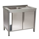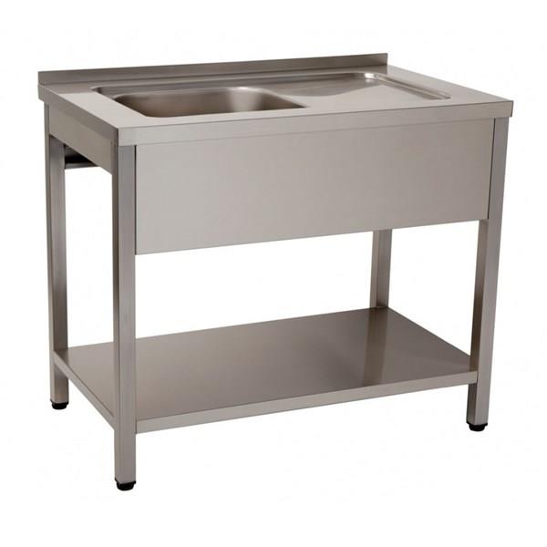 Feito em aço inox, estrutura sólida, com uma prateleira, uma cuba (330x330x200). Inclui tampo com rebaixo na zona da cuba e alçado traseiro de 4 cm.
