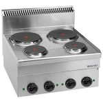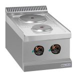 Estrutura em aço inoxidável AISI 304. Placa de rápido aquecimento com sistema de proteção de sobreaquecimento. Regulador de energia com 7 posições de temperatura; sinalizador luminoso indica se uma placa está ativa; manípulos ergonómicos com anel de proteção anti resíduos; zona de trabalho estampada. Forno multifunções elétrico de 4.3 kW: forno (2.5 kW) e grill elétrico (1.8 kW). Forno ventilado.