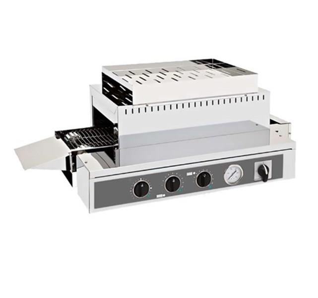 Estrutura em aço inox. Regulador de velocidade do tapete. Regulação de potência superior e inferior independente. Termómetro analógico.